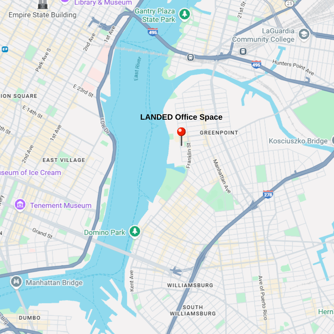 Our workspace is located in Green Point, NYC complete with Kitchen, Conference Rooms, and Printing Services.